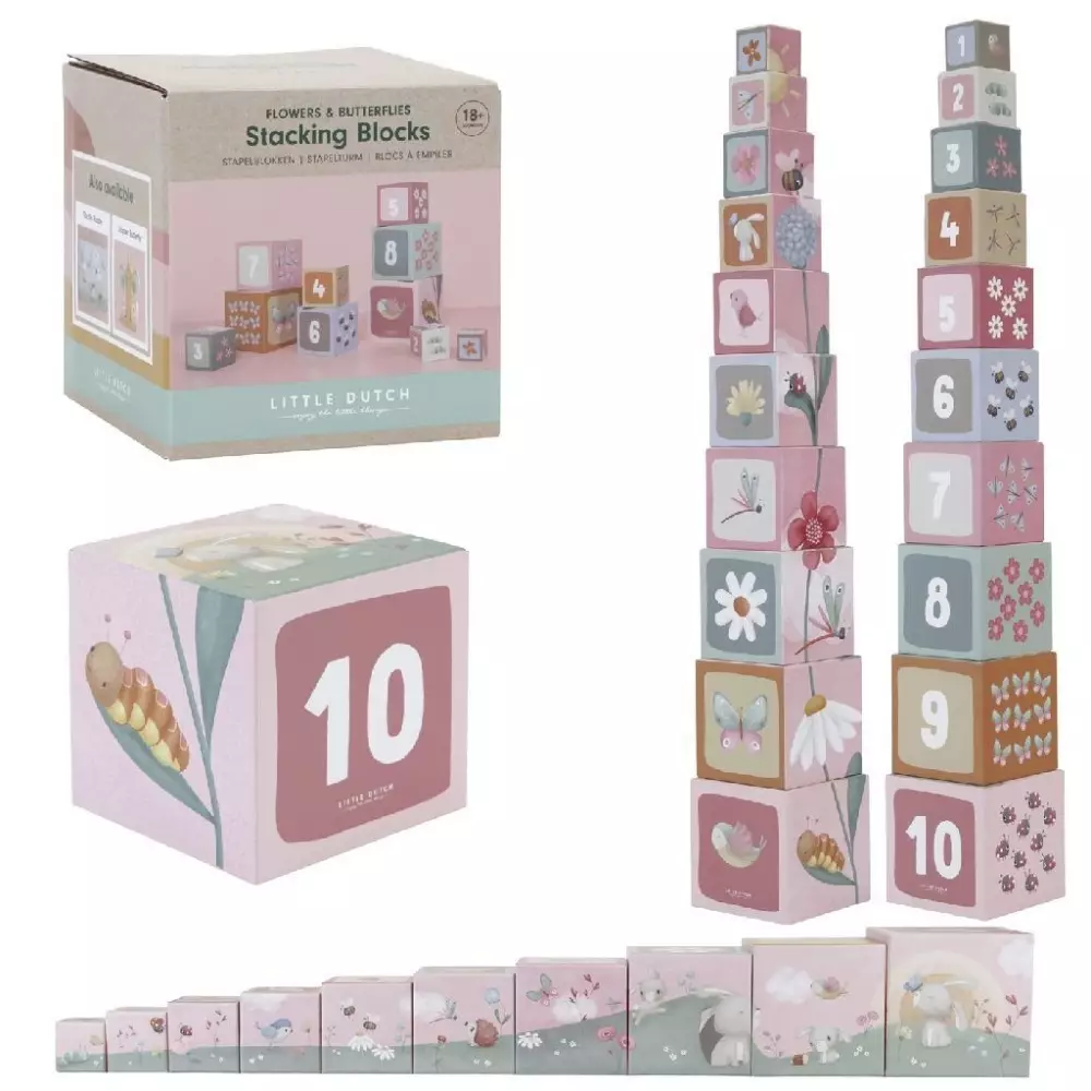 Bonitos bloques apilables decorados en todas sus caras con la delicadeza que Little Dutch nos presenta siempre. Una cara con números, otra con la representación del valor del número con dibujitos, otra con divertidas imágenes de mariposas, flores e insectos, y otra cara, que una vez apilados, conforma un gran dibujo de flores, como un puzzle! Además también se pueden encajar unas piezas dentro de otras.