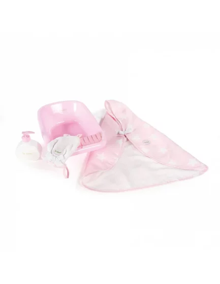 Perfecta bañerita de plástico rosa de Charlotte, para poder bañar a tu muñeca como si fuera un bebé de verdad. Incluye una mantita de imitación para que los niños sequen a sus muñecas después de bañarlas. Este kit de aseo incluye jabón, una capa de baño y unas manoplas.