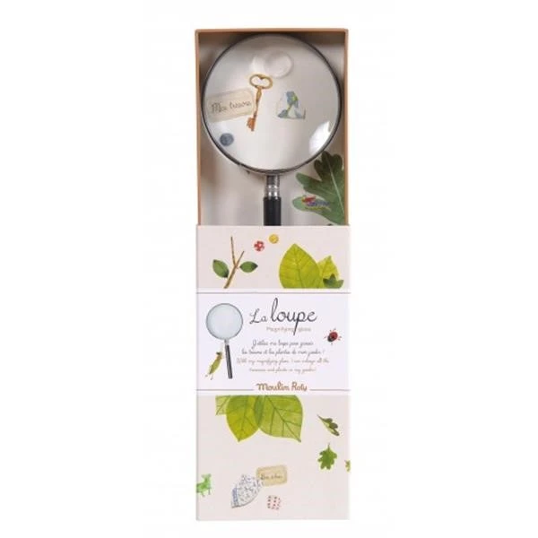 Observemos todo bien de cerca con esta fantástica lupa de la colección «Le jardin» de Moulin Roty. Presentada en una preciosa caja ilustrada con bellos motivos vegetales.
