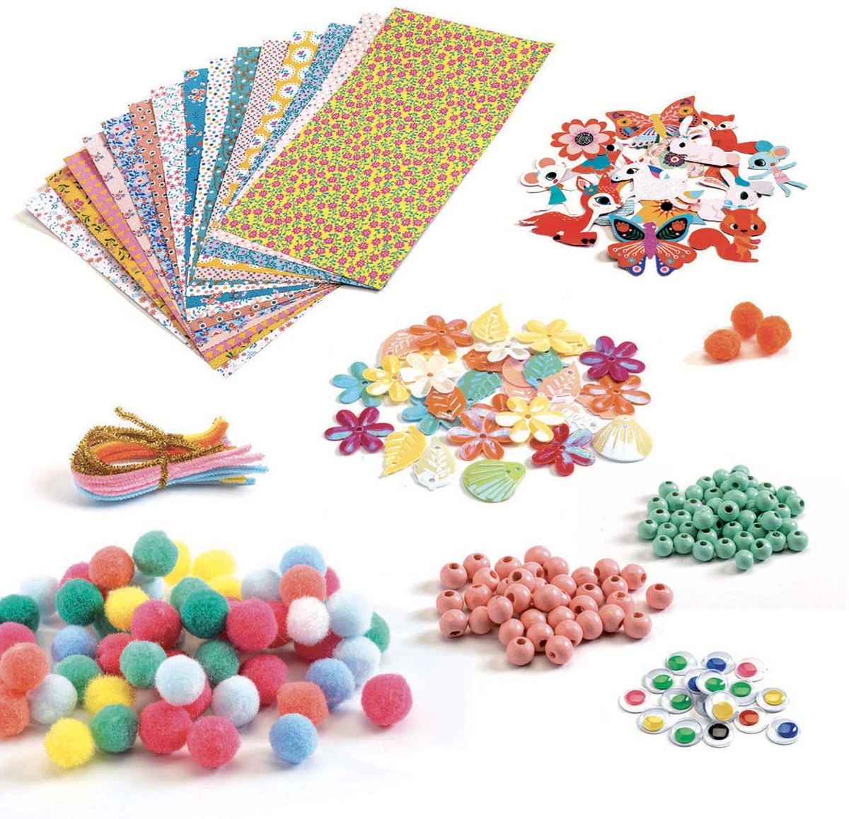 Pegar, recortar, ensartar…para dar rienda suelta a la creatividad. En la caja hay de todo, pompones, ojitos móviles, cuentas de madera, papeles de diferentes estampados y texturas, chenillas…y Djeco nos da un motón de ideas con 15 fichas explicadas paso a paso, pero sobre todo ofrece inspiración para creaciones propias. Horas de diversión asegurada.