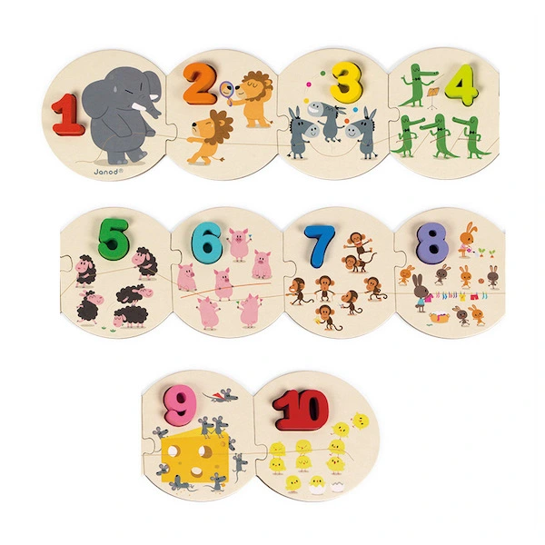 Este puzzle gigante es perfecto para aprender a contar del 1 al 10. Se trata de un puzzle formado por 10 piezas de madera con ilustraciones de animales y 10 números de madera para encajar en cada una de ellas.